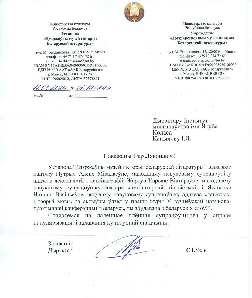 Падзяка Дзяржаўнага музея гісторыі Беларускай літаратуры