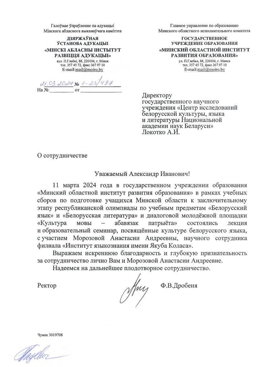 Падзяка Мінскага абласнога інстытута развіцця адукацыі