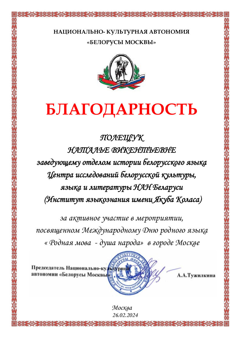 Падзяка нацыянальна-культурнай аўтаноміі "Беларусы Масквы"