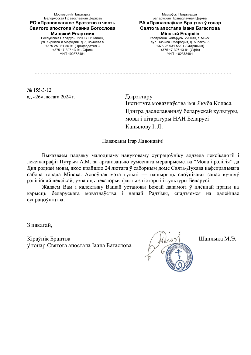 Падзяка Праваслаўнага Брацтва ў гонар Святога апостала Іаана Багаслова Мінскай Епархіі МП БПЦ